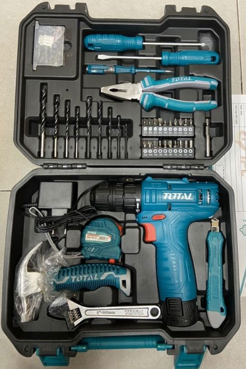 Bộ 128 món gồm: 1 máy khoan dùng pin Lithium-Ion 12V/ 1.5Ah, model: TDLI1211, Kèm theo 1 pin và 1 sạc 2h, 1 mũi vít thép CR-V 65mm, , 1 búa nhổ đinh 8OZ, 1 tua vit SL5.5x100, 1 tua vít PH1x100, 1 kềm răng 7 inch, 1 mỏ lết 6 inch, , 1 bút thử Điện áp thử nghiệm 100-500VAC, 1 thước kéo 3M, 1 lưỡi dao , 5 Mũi khoan xoắn 2,3,4,5,6mm, 4 Mũi khoan gỗ size: 4,5,6,8mm, 20 tua vít SL3, SL4, SL5, SL6, PH0, PH1, PH2, PH3, PZ0, PZ1, PZ2, PZ3, T10, T15, T20, T30, H3, H4, H5, H6, 7 shocket chất liệu CR-V size: 5, 6,7,8,9,10, 11mm , 1 mũi từ, 1 cưa sắt mini, 40 ốc (20pcs*ST3.5,10pcs*ST4,10pcs*ST5), 40 bake nhựa (20pcs*5mm,10pcs*6mm,10pcs*8mm), 1 socket 25mm, 6 socket lục giác 1/4 inch (5mm 6mm 8mm 9mm 10mm 11mm)