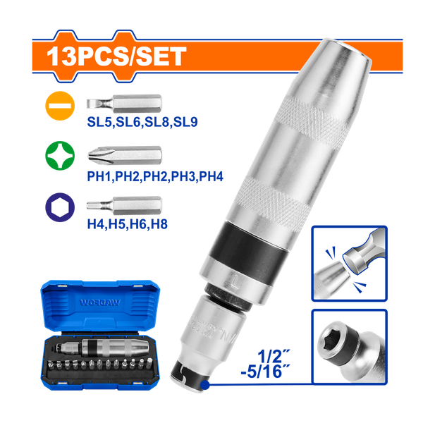 • Bộ tua vít bắt vít đóng xuyên 13 chiếc Bao gồm: 1 Bộ điều khiển tác động, 1 Bộ chuyển đổi đầu 1/2"-5/16", 13 chiếc mũi tua vít: SL5/ SL6/ SL8/ SL9/PH1/ PH2*2/PH3/ PH4/H4/H5/H6/H8 Bit