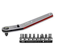 -9 mũi vít dài 19mm: • 1 mũi vít 2 cạnh: (-)6 • 3 mũi vít 4 cạnh: (+)1, (+)2, (+)3 • 5 mũi vít lục giác: H2.5, H3, H4, H5, H6 -1 tay vặn cong(lên) có bánh cóc (16 răng) -1 khay đựng mũi vít