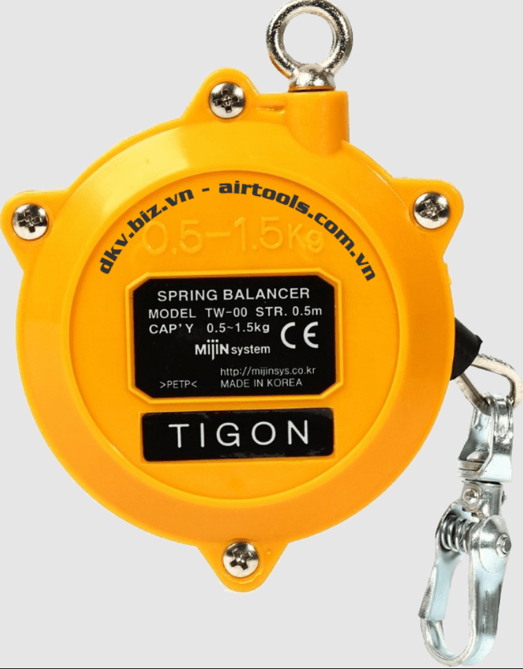 Pa lăng cân bằng Tigon TW-00, Tigon Sring balancer TW-00: là loại pa lăng cân bằng hay còn gọi (Pa lăng lò xo tự rút) của hãng Tigon thuộc dòng series TW, có sức nâng từ: 0.5 - 1.5 kg , hành trình: 0.5 m, đường kính cáp: 2 mm, chuyên dùng để treo các loại súng hoặc vật dụng trong nhà xưởng, cần thao tác nhanh.
