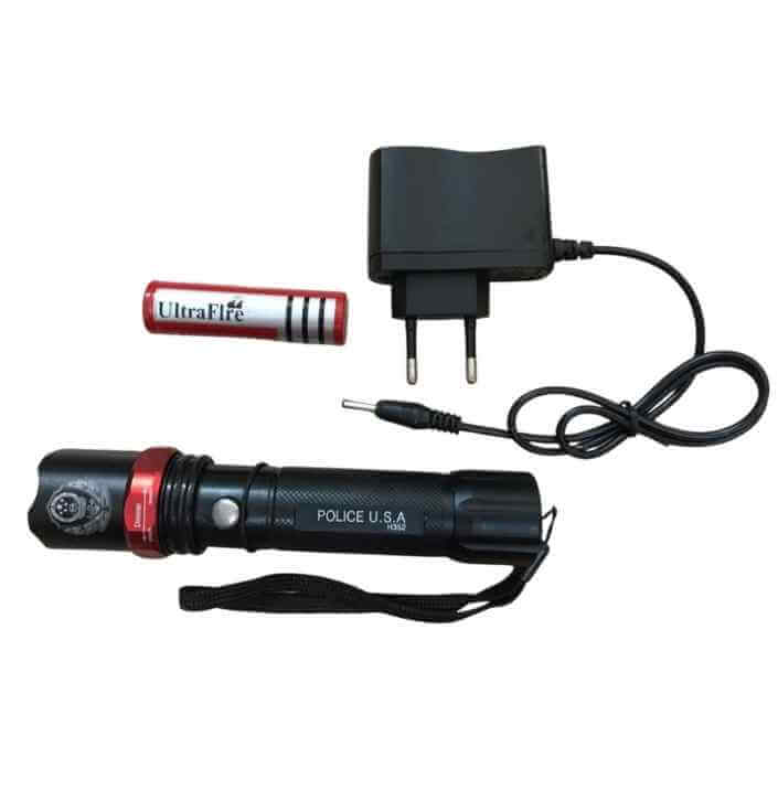 - Sản phẩm gồm: 1 đèn pin siêu sáng Swat + 1 pin sạc + 1 adapter sạc + 1 khay 3 pin AAA + 1 dây đeo tay, 1 hộp đựng.