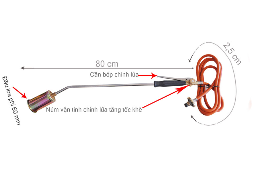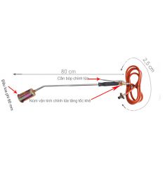 Dây dài 2.5 m, tay đuốc cần dài 80 cm ,đầu khò rộng 60 mm,dùng bình ga 12kg.