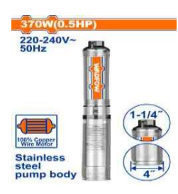 Điện áp: 220-240V~50Hz. Công suất định mức: 370W(0.5HP). Cột áp tối đa: 42m. Lưu lượng tối đa: 4.5m³/h. Đường kính ống: 1-1/4". Thân bơm giếng: 4". Cánh quạt: 6 tầng. Động cơ dây đồng. Thân bơm: Thép không gỉ. Cáp dài 15m. Điện dung tích hợp. Cổng vào và ra bằng gang. Buồng dầu bằng gang.