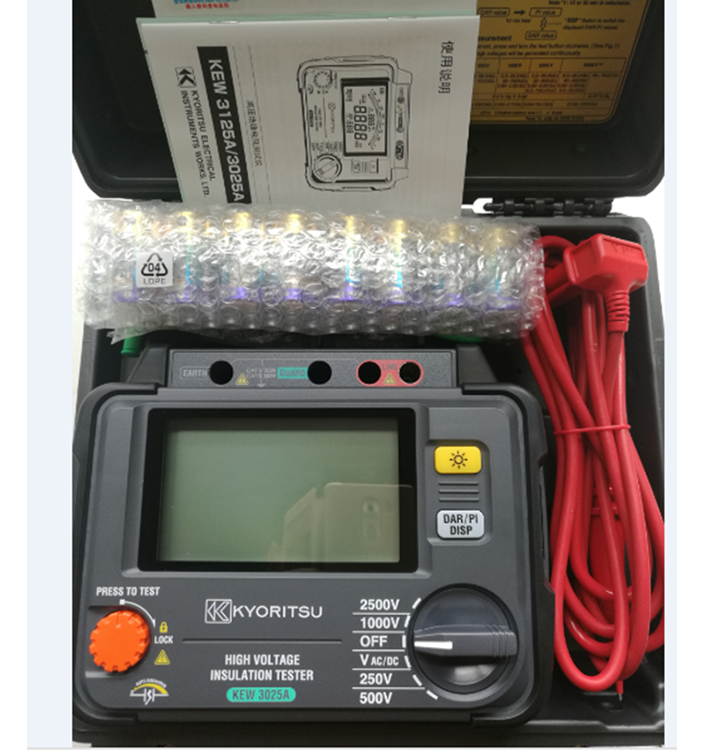 Đo điện trở cách điện Kyoritsu 3025A là đồng hồ đo và kiểm tra cho dòng điện 250V/500V/1000V/2500V. Đồng hồ đo điện trở có núm vặn để khóa/mở tiện dụng. Kyoritsu 3025A được làm bằng nhựa cách điện chịu lực cực tốt. Máy hỗ trợ thêm đèn sáng để làm việc trong bóng tối, đem lại sự tiện ích cho người sử dụng.