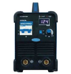 MMA250PRO nổi bật với lớp sơn màu xanh dương bắt mắt, tạo nên vẻ ngoài ấn tượng và dễ nhận diện. Mặt trước của máy được bố trí các nút điều khiển chức năng chính, giúp người dùng thao tác dễ dàng và chính xác. Phía sau máy là hệ thống quạt tản nhiệt, dây cáp nguồn và chốt dây nối đất, đảm bảo an toàn và sự thông thoáng trong quá trình vận hành.
