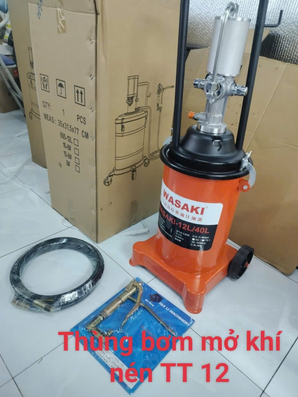 Bơm mỡ bò khí nén Wasaki 12 lít(kg) hay Thùng bơm mỡ khí nén wasaki 12 lit (kg) là dòng bơm mỡ có thùng chứa 12 lít (kg) đến từ thương hiệu Wasaki Japan Nhật Bản được nhiều người tin dùng bởi chất lượng sản phẩm ổn định,mẫu mã hàng hóa chắc chắn,nhất giá thành rẻ so với các dòng bơm mỡ bò 12 lít trên thị trường
