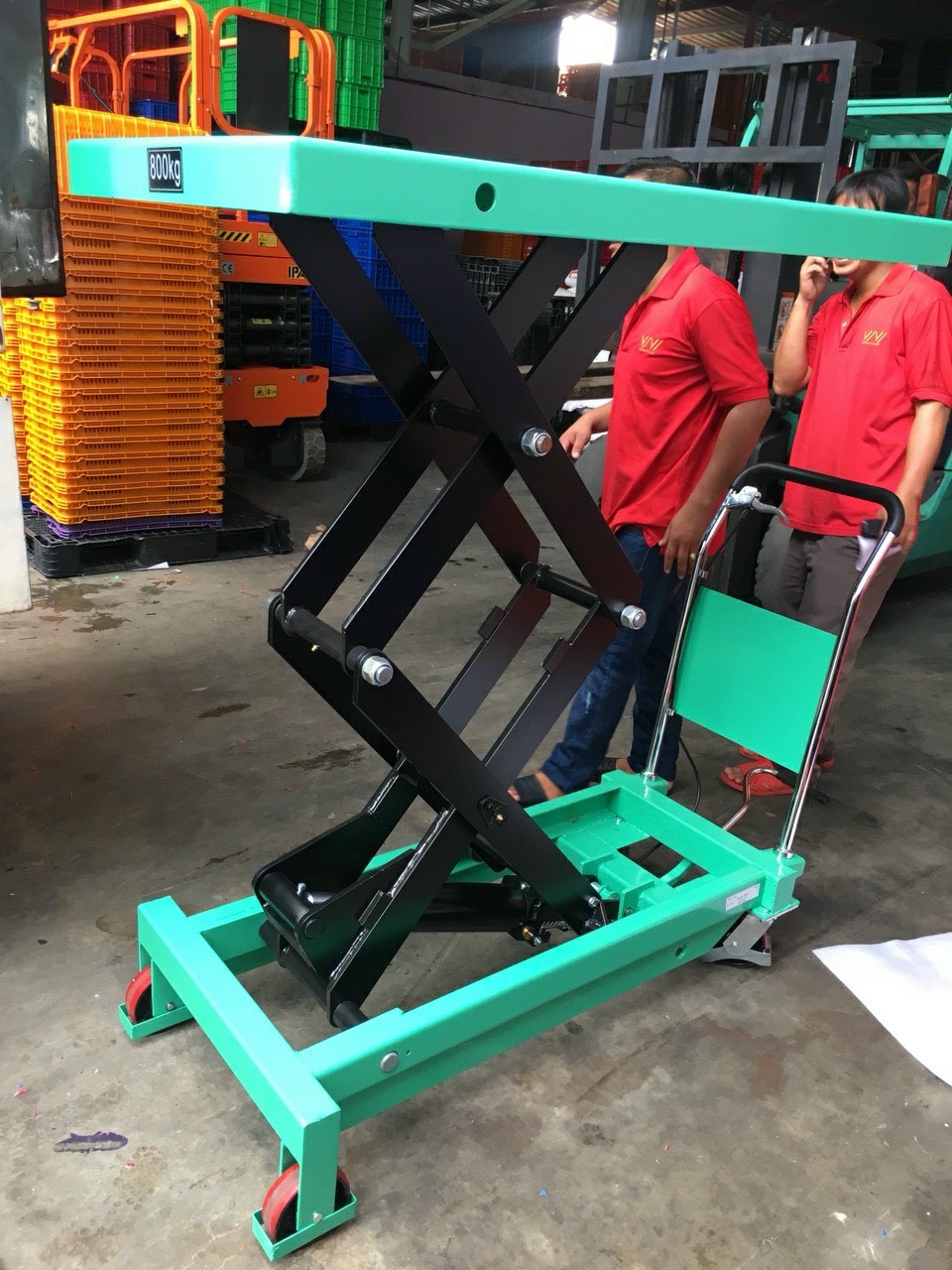 Xe nâng mặt bàn TT800 là loại xe nâng có thiết kế hệ thống nâng thủy lực hình dạng 2 chữ X, vận hành bằng kích chân và xả tay, có phanh định vị.