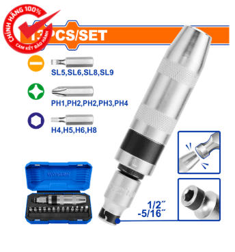 • Bộ tua vít bắt vít đóng xuyên 13 chiếc Bao gồm: 1 Bộ điều khiển tác động, 1 Bộ chuyển đổi đầu 1/2"-5/16", 13 chiếc mũi tua vít: SL5/ SL6/ SL8/ SL9/PH1/ PH2*2/PH3/ PH4/H4/H5/H6/H8 Bit
