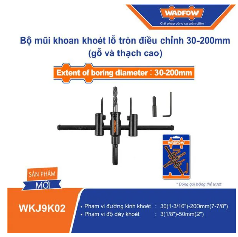 • BỘ MŨI KHOAN KHOÉT LỖ TRÒN ĐIỀU CHỈNH 30-200MM (GỖ VÀ THẠCH CAO) WADFOW WKJ9K02