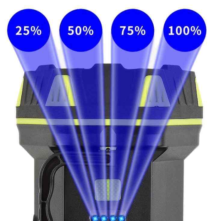 Chế độ sáng mạnh: Phù hợp cho các hoạt động cần ánh sáng rõ ràng như cắm trại hay tìm kiếm đồ dùng trong bóng tối.
