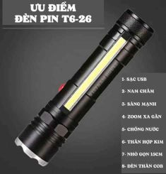 Đèn pin siêu sáng T6-26 là một trong những sản phẩm đèn pin tiên tiến nhất hiện có trên thị trường, được thiết kế đặc biệt dành cho những người yêu thích khám phá và những hoạt động ngoài trời như cắm trại, câu cá, đi bộ đường dài, và nhiều hoạt động khác. Với công nghệ chiếu sáng LED T6 hiện đại, sản phẩm mang đến khả năng chiếu sáng cực mạnh, bền bỉ và hiệu suất sử dụng tối ưu.