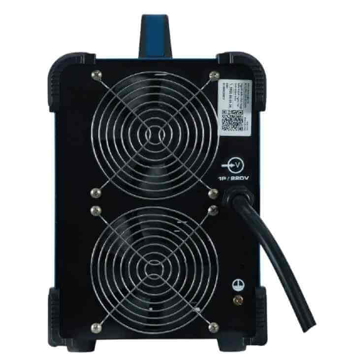 MMA250PRO nổi bật với lớp sơn màu xanh dương bắt mắt, tạo nên vẻ ngoài ấn tượng và dễ nhận diện. Mặt trước của máy được bố trí các nút điều khiển chức năng chính, giúp người dùng thao tác dễ dàng và chính xác. Phía sau máy là hệ thống quạt tản nhiệt, dây cáp nguồn và chốt dây nối đất, đảm bảo an toàn và sự thông thoáng trong quá trình vận hành.